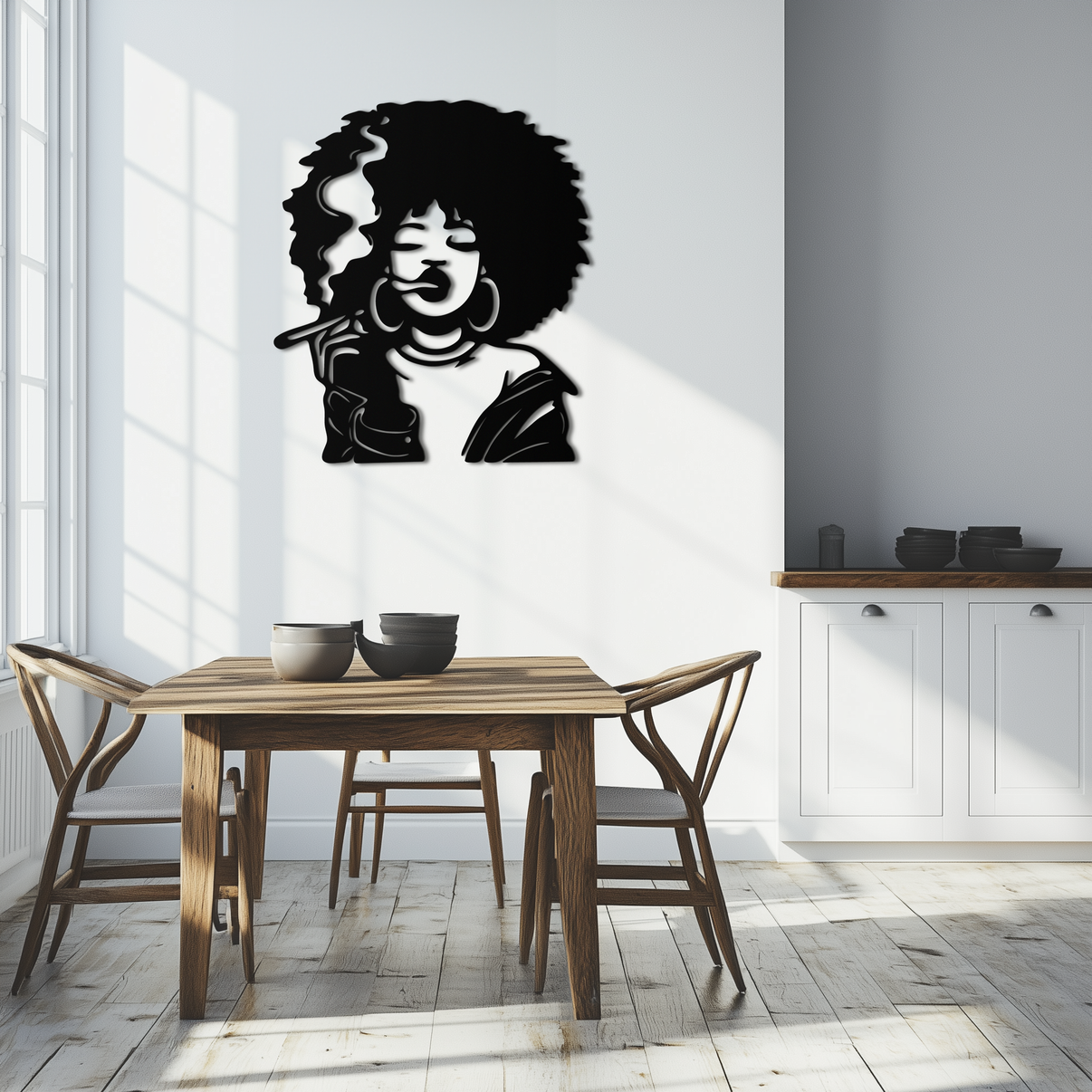 Make a bold statement with our "Afro Woman Smoking" silhouette metal wall art. This captivating design features a confident woman with an Afro hairstyle, large hoop earrings, and a relaxed demeanor, smoking with style and attitude. Crafted from high-quality metal, this piece adds character and artistic flair to any modern space. Perfect for studios, lounges, or anyone who appreciates expressive and fearless decor.