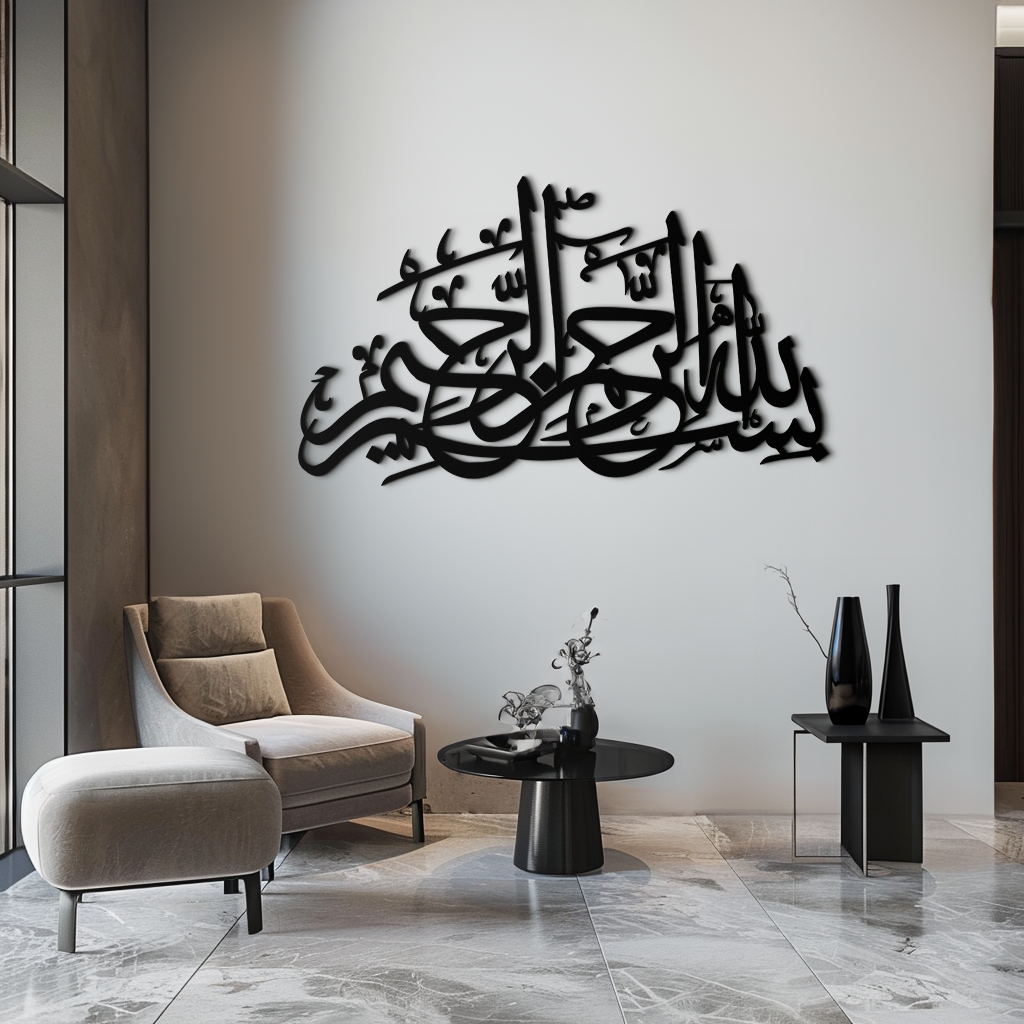 Bring spiritual elegance into your home with this Bismillahirrahmanirrahim Metal Wall Art. Designed with intricate Arabic calligraphy, this piece showcases the revered phrase "Bismillahirrahmanirrahim" in a modern yet traditional aesthetic. Perfect for adding a serene and sophisticated touch to your living space, prayer room, or office.