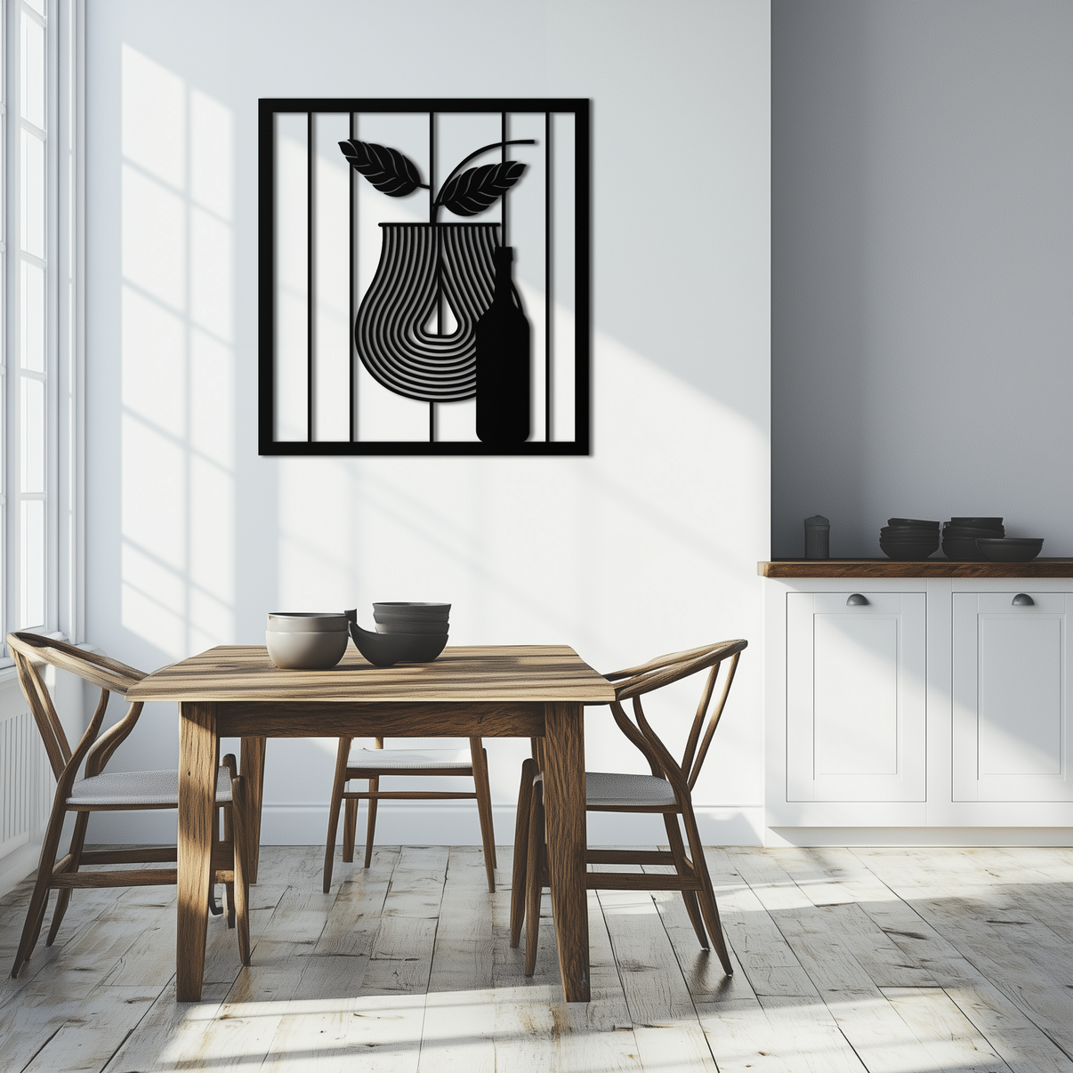 Add a modern flair to your kitchen or dining area with this Bottle and Leaf Metal Wall Art. Featuring a stylized bottle and curved leaves set within a minimalist frame, this striking design brings elegance and sophistication to your interior. The flowing lines and symmetry offer a contemporary touch that complements modern, rustic, or industrial decor styles.