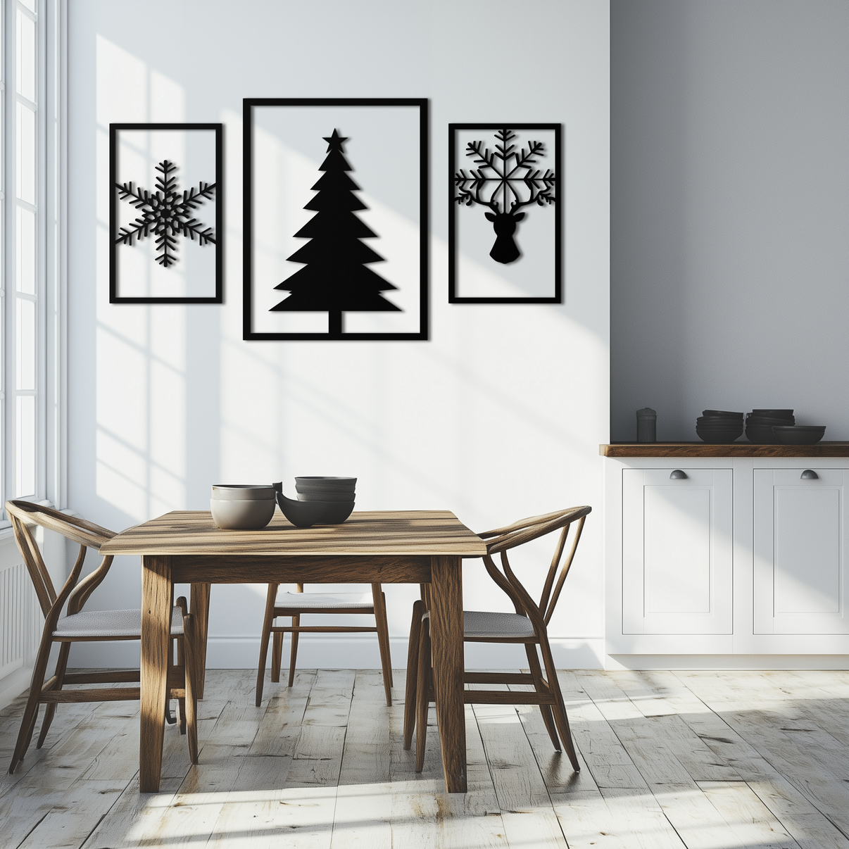 Christmas Tree & Reindeer Metal Wall Art Set – 3 Piece Modern Holiday Decor- KAF377