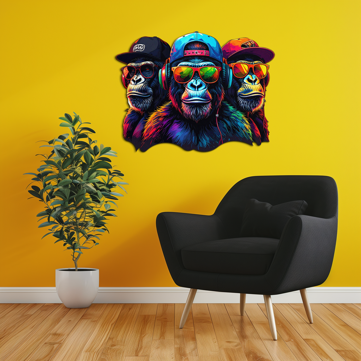 The Cool Gorilla Trio Metal Wall Art brings serious street cred to your space. With neon fur, hats, sunglasses, and headphones, these three are ready to take over your wall — and your playlist.