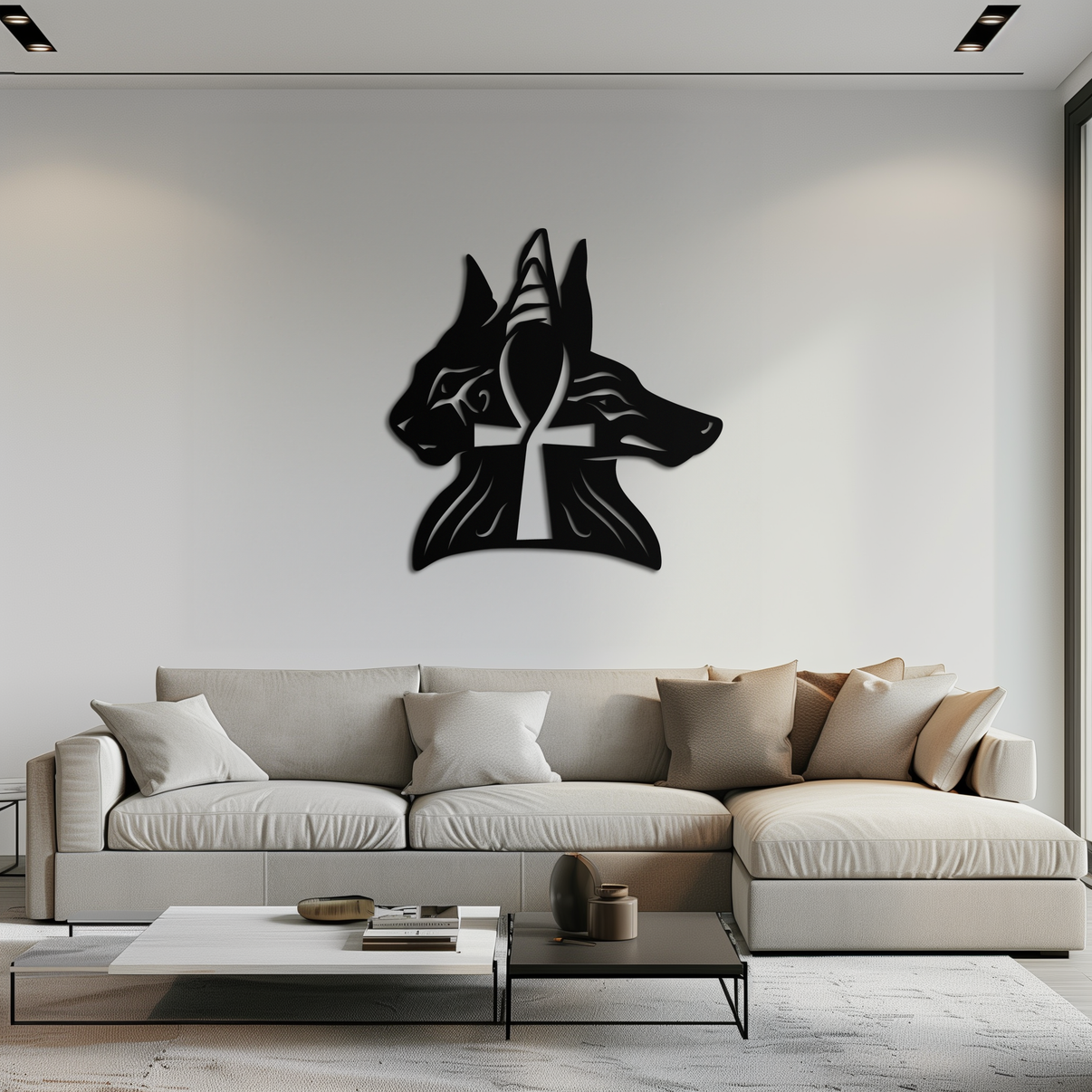 Bring the mystery and power of ancient Egypt into your home with our Egyptian Cat and Jackal Metal Wall Art. This striking design features a cat and jackal silhouette intertwined with an ankh cross, crafted from premium 1.5mm steel and finished in durable matte black electrostatic powder coating. Perfect for living rooms, offices, or meditation spaces.