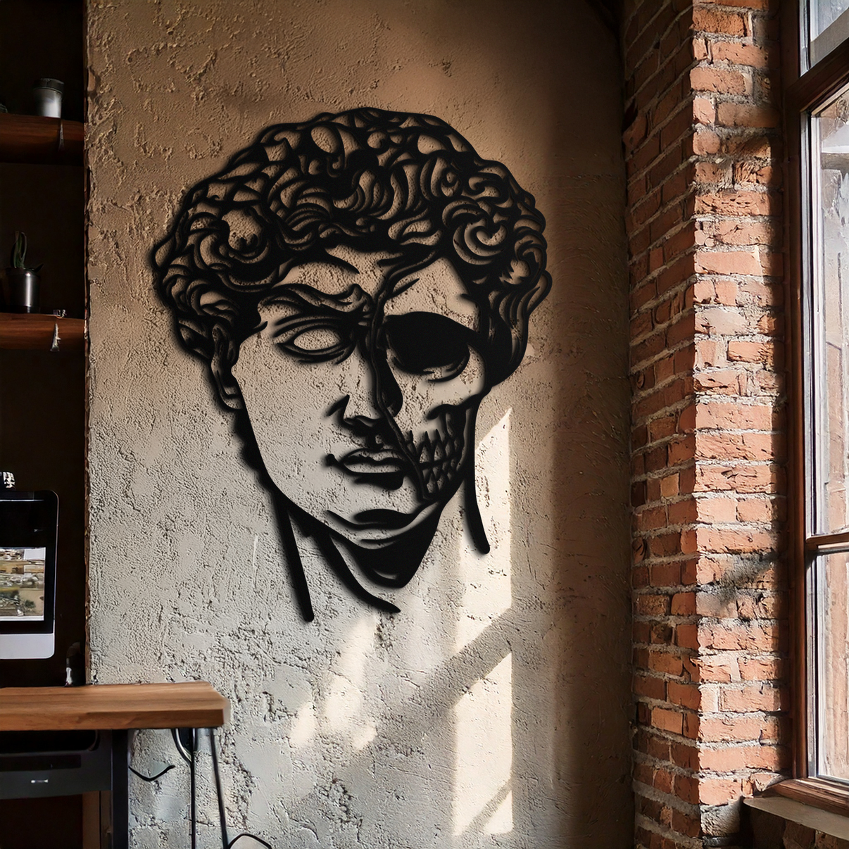 Bring together classical elegance and edgy contemporary style with this Half Skull David Head Metal Wall Art. Featuring a fusion of Michelangelo's David and a haunting skeletal split, this striking piece adds a unique artistic flair to any modern interior. Crafted from 1.5 mm premium metal and finished in matte black electrostatic paint, it offers bold contrast and exceptional durability.