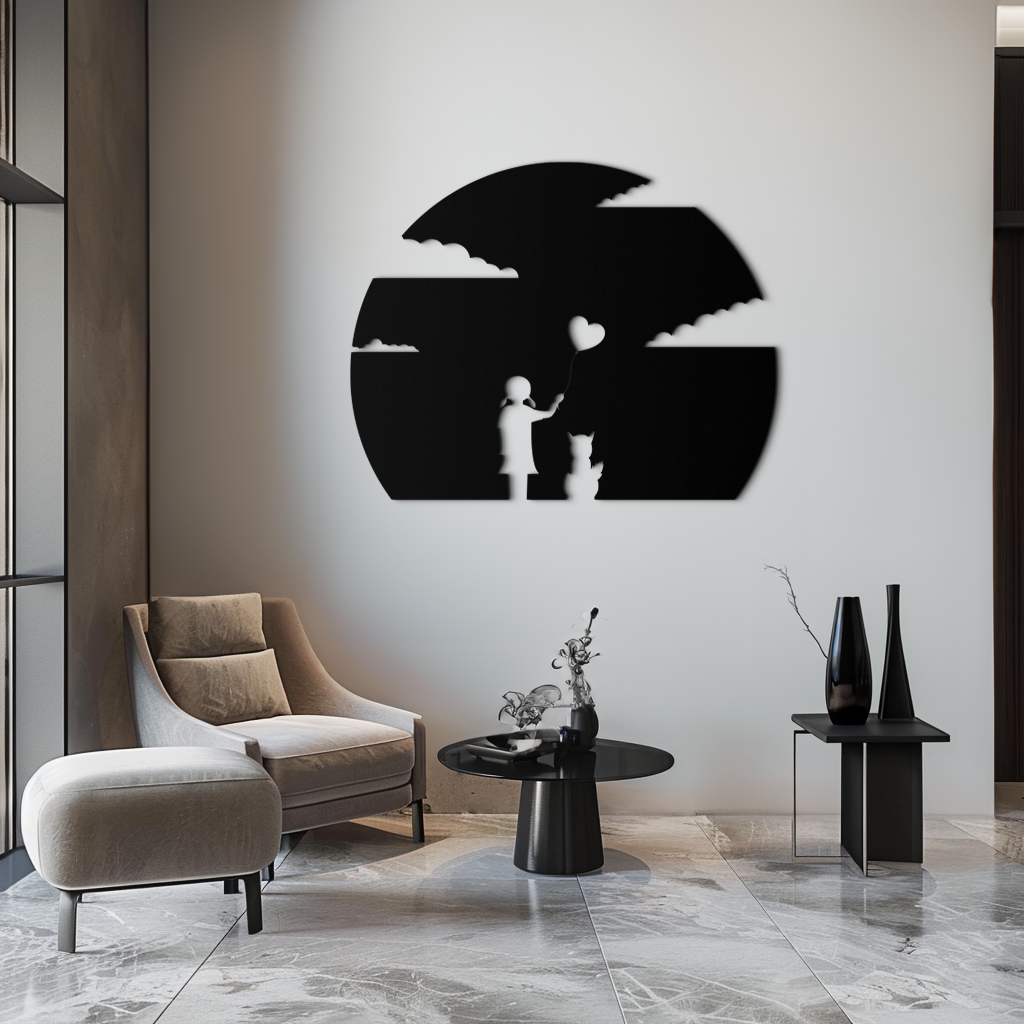 Bring an enchanting touch to your space with this Heart Balloon Girl & Cat Metal Wall Art. This minimalist yet heartwarming design features a little girl reaching out for a floating heart-shaped balloon, accompanied by her loyal feline companion. The silhouette effect gives the artwork a dreamy, nostalgic aesthetic, making it an excellent addition to nurseries, bedrooms, or cozy living spaces.