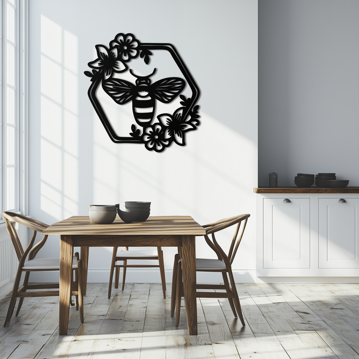 This modern Floral Bee Silhouette metal wall art is the perfect way to add a touch of sophistication and artistic beauty to your home. Order yours today.