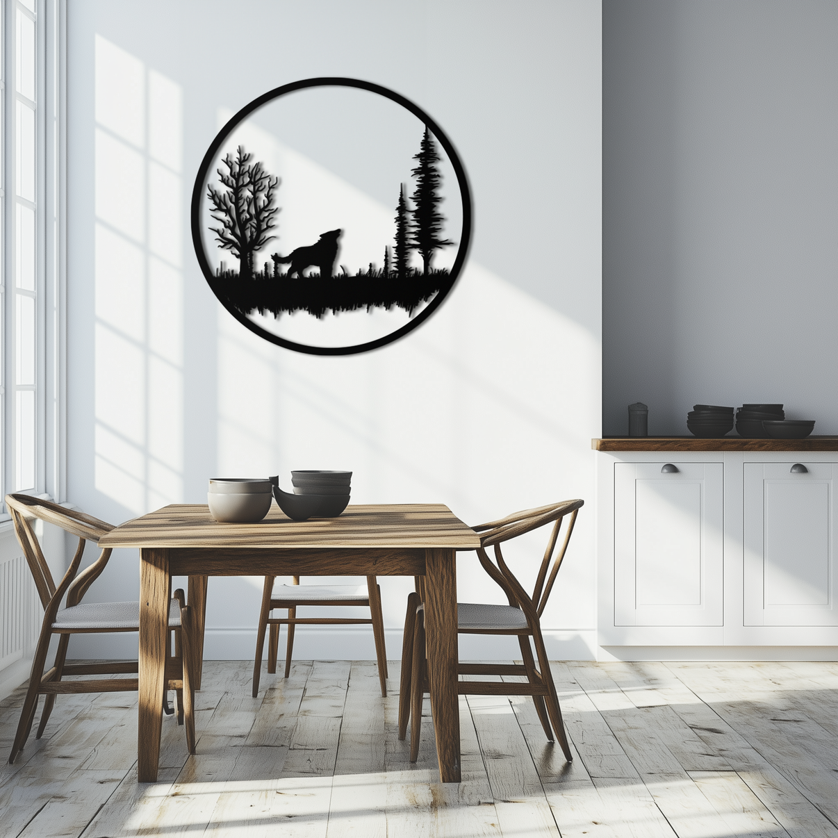 Embrace the call of the wild with this Howling Wolf Metal Wall Art, a beautifully crafted piece that brings the mystique of nature into your home. Designed with a striking silhouette of a lone wolf howling amidst trees, this circular steel artwork captures the essence of the wilderness.
