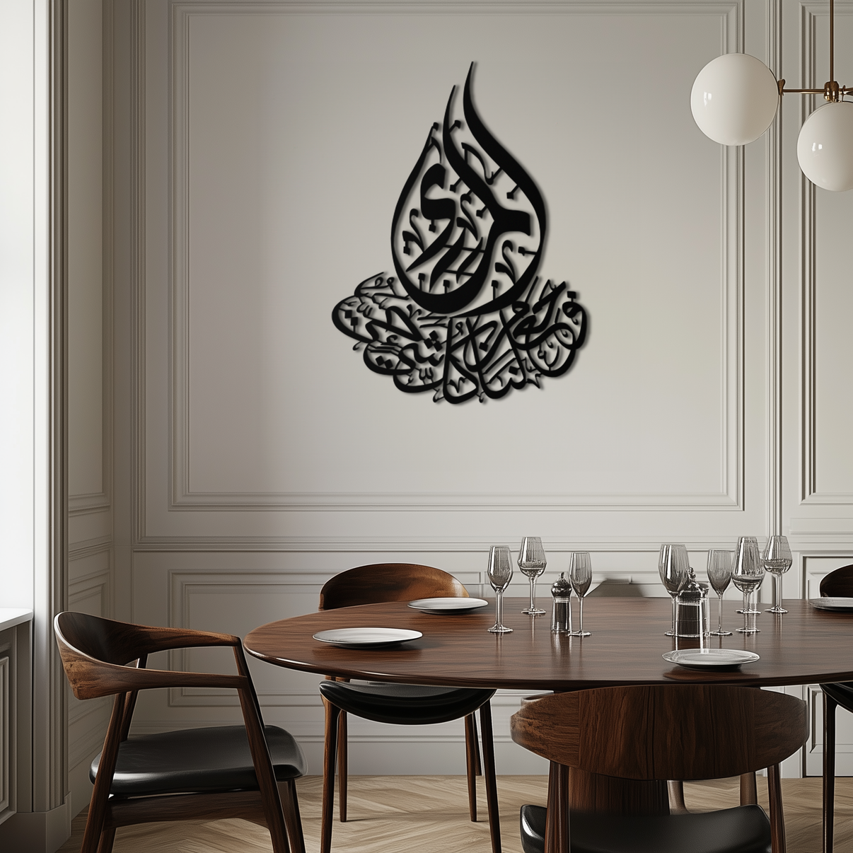 Enhance your home with the elegance of Islamic Calligraphy Metal Wall Art, featuring intricate Arabic script in a stunning teardrop design. Crafted from 1.5mm premium steel, this unique artwork is an exquisite fusion of spirituality and modern craftsmanship.