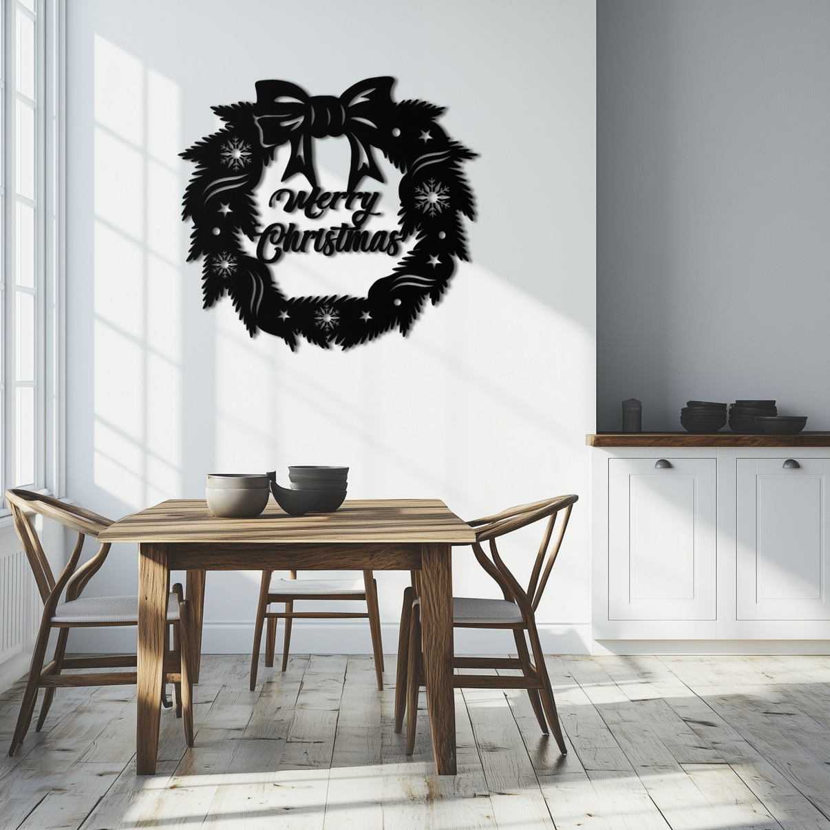 Celebrate the holiday spirit with this Merry Christmas Wreath Metal Wall Art. Designed with festive pine leaves, stars, and a ribbon bow, this cheerful piece brings the warmth of Christmas into your home. Perfect for entryways, living rooms, or fireplaces, it adds a joyful holiday touch wherever it hangs.