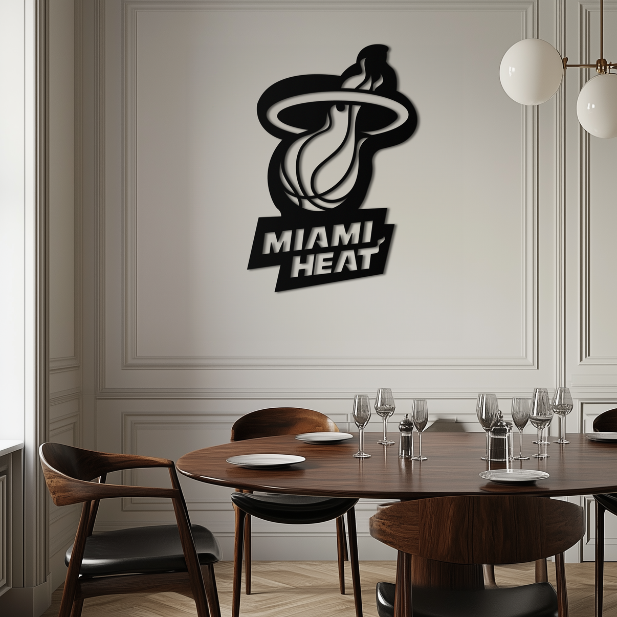 Show off your love for basketball with this striking Miami Heat metal wall art. Featuring the iconic flaming basketball and hoop design, this wall piece brings bold energy and sporty style to any room. Precision-cut from high-quality black metal, it's a perfect statement piece for game rooms, man caves, or sports-themed interiors.