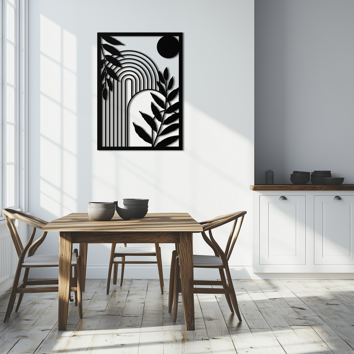 Add contemporary flair to your space with this Modern Geometric Botanical Metal Wall Art. Combining minimalist plant silhouettes with bold arched lines and sun shapes, this piece captures a blend of nature and modern geometry. Perfect for living rooms, bedrooms, entryways, or modern office walls.