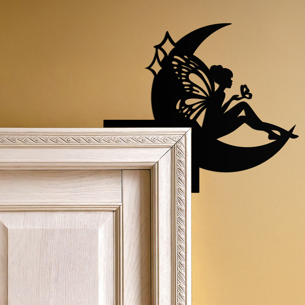 Add a magical accent to your space with this Moon Fairy Corner Metal Wall Art. Featuring a delicate fairy perched on a crescent moon, gently holding a butterfly, this piece brings charm and fantasy to your door frames or wall corners. Expertly crafted from durable 1.5 mm premium metal and finished in sleek matte black, this design blends fantasy with elegance for enchanting home decor.