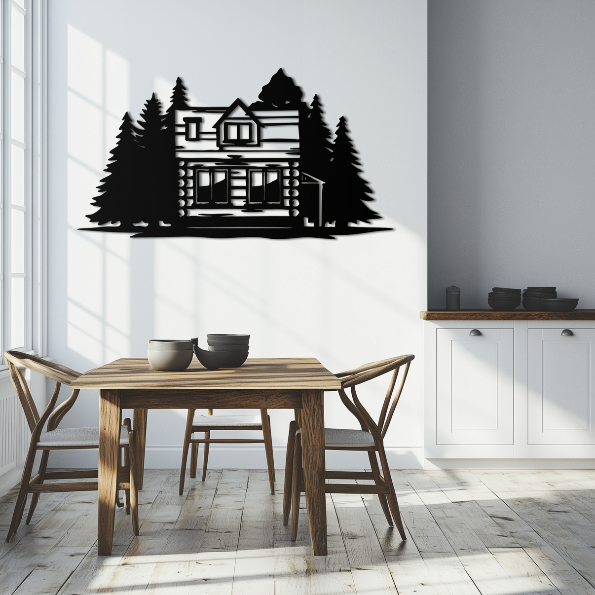 Bring the serene charm of nature into your living space with this Mountain Log Cabin Metal Wall Art. Featuring a detailed silhouette of a cozy log cabin surrounded by majestic pine trees, this rustic piece is a perfect fit for lovers of the outdoors. Crafted from high-quality metal, it offers durability and elegance for both indoor and outdoor spaces.