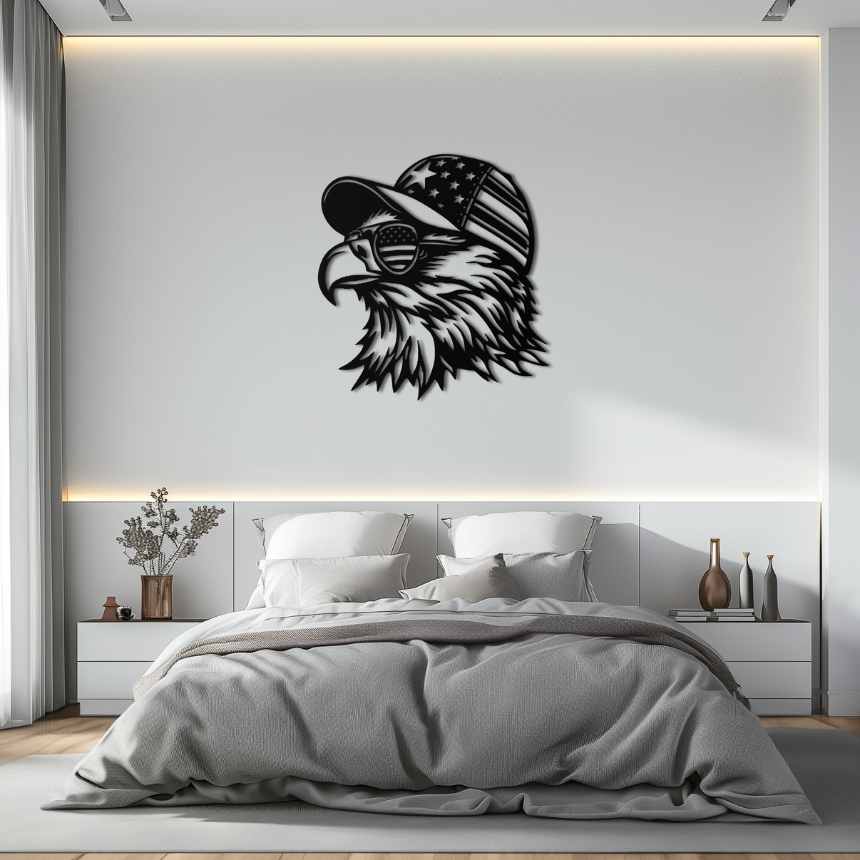 Show off your patriotic spirit with our Patriotic Eagle Silhouette Metal Wall Art. Featuring a bold eagle wearing sunglasses with the American flag and a matching cap, this powerful design brings a sense of freedom, pride, and strength to any room. Crafted from premium 1.5mm steel and finished with a durable matte black electrostatic powder coating, it offers both lasting beauty and iconic symbolism.