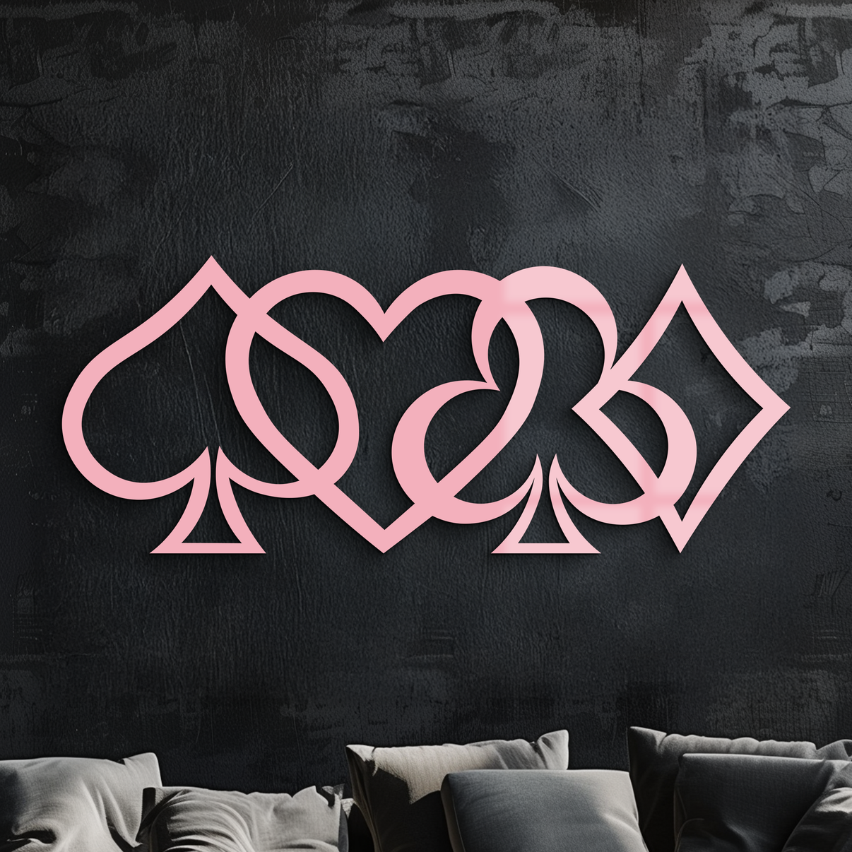 Bring the excitement of poker nights and the elegance of card games into your space with this Playing Card Suits Metal Wall Art. Featuring the four iconic symbols—spade, heart, club, and diamond—intertwined in a modern silhouette, this piece is crafted from premium quality metal and finished with durable black powder coating. Perfect for game rooms, bars, living spaces, or as a unique gift for card enthusiasts.