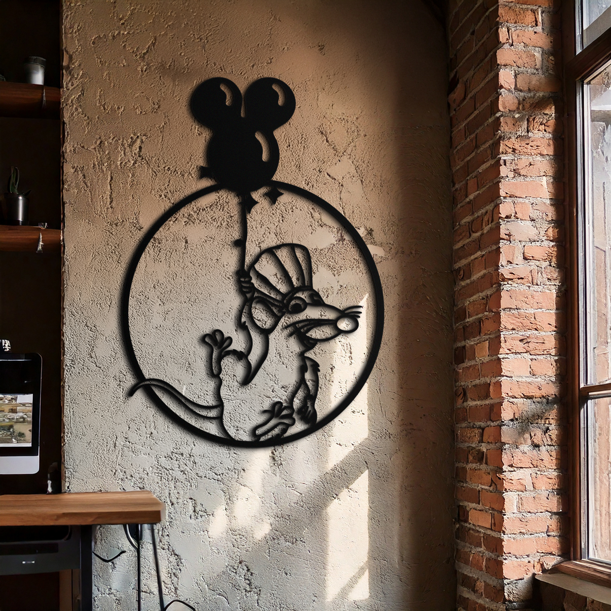 Add a dash of whimsy to your kitchen with this Ratatouille Chef Metal Wall Art. Featuring a charming cartoon rat in a chef’s hat holding a balloon shaped like mouse ears, this design is inspired by the beloved culinary film. Made from 1.5 mm premium metal with a sleek matte black finish, it’s perfect for kitchens, restaurants, or anyone who loves to cook with a smile.