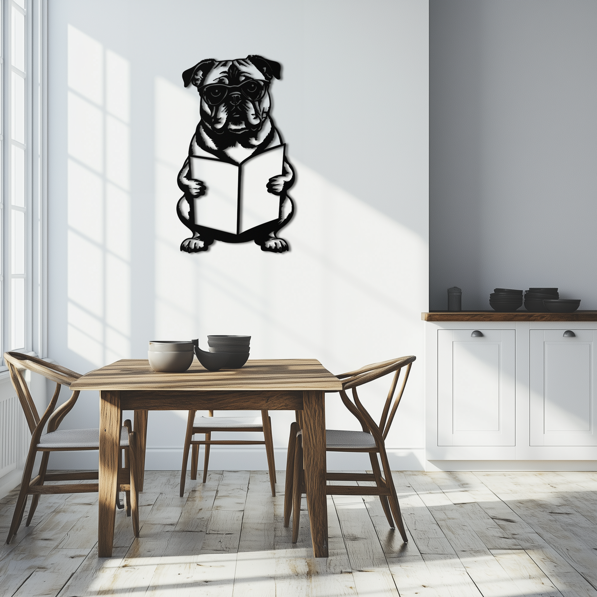 Add a playful and intellectual charm to your space with our Reading Dog Silhouette Metal Wall Art. Featuring a clever dog wearing glasses and reading a book, this delightful design brings warmth, humor, and character to any room. Crafted from premium 1.5mm steel and finished with a durable matte black electrostatic powder coating, it offers both lasting durability and stylish appeal.