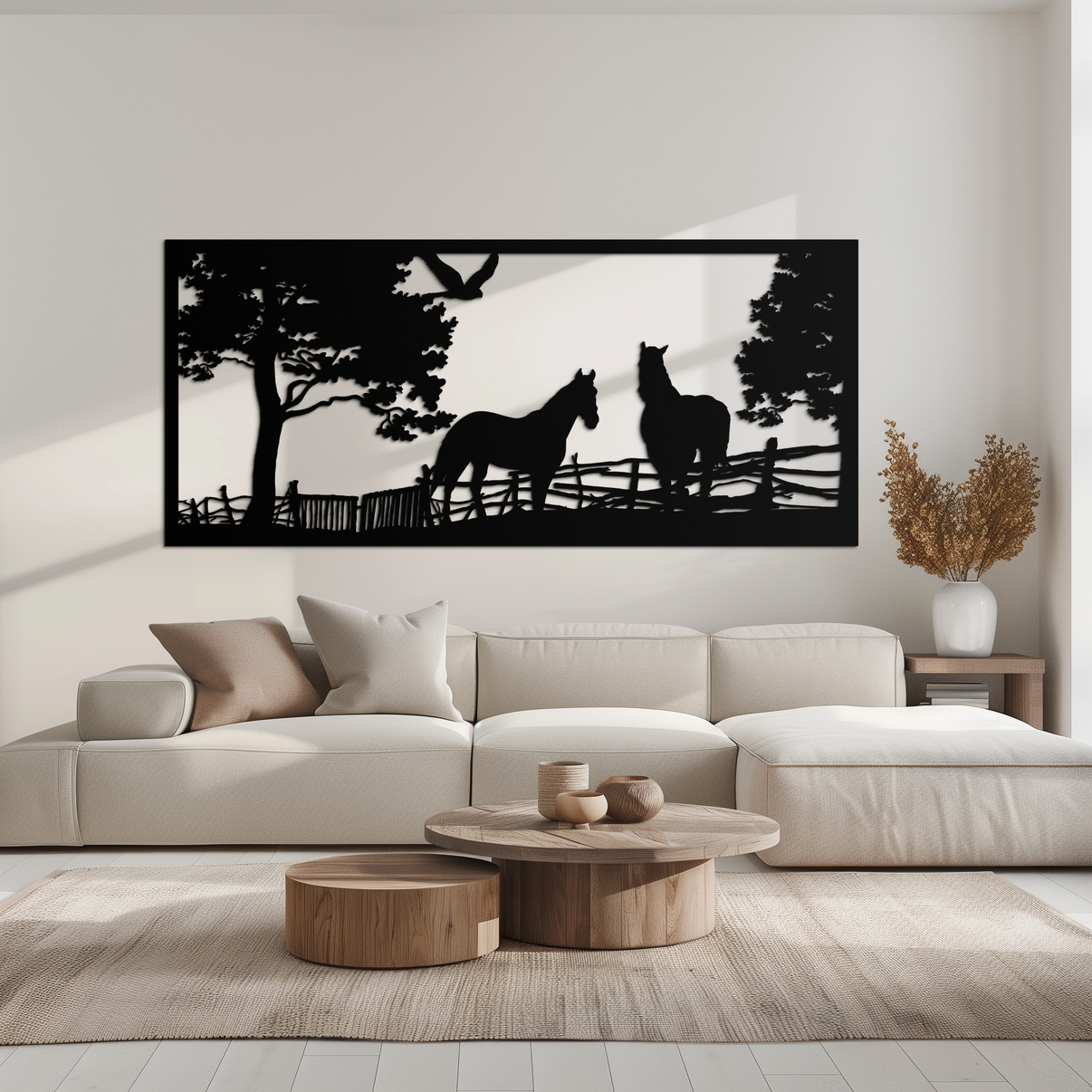Bring the serenity of the countryside into your space with this Rustic Horse Farm Metal Wall Art. Crafted from 1.5mm premium steel, this stunning piece captures the peaceful beauty of horses in a farm setting. The electrostatically applied coating ensures a rust-resistant and fade-proof finish, making it suitable for both indoor and outdoor use.