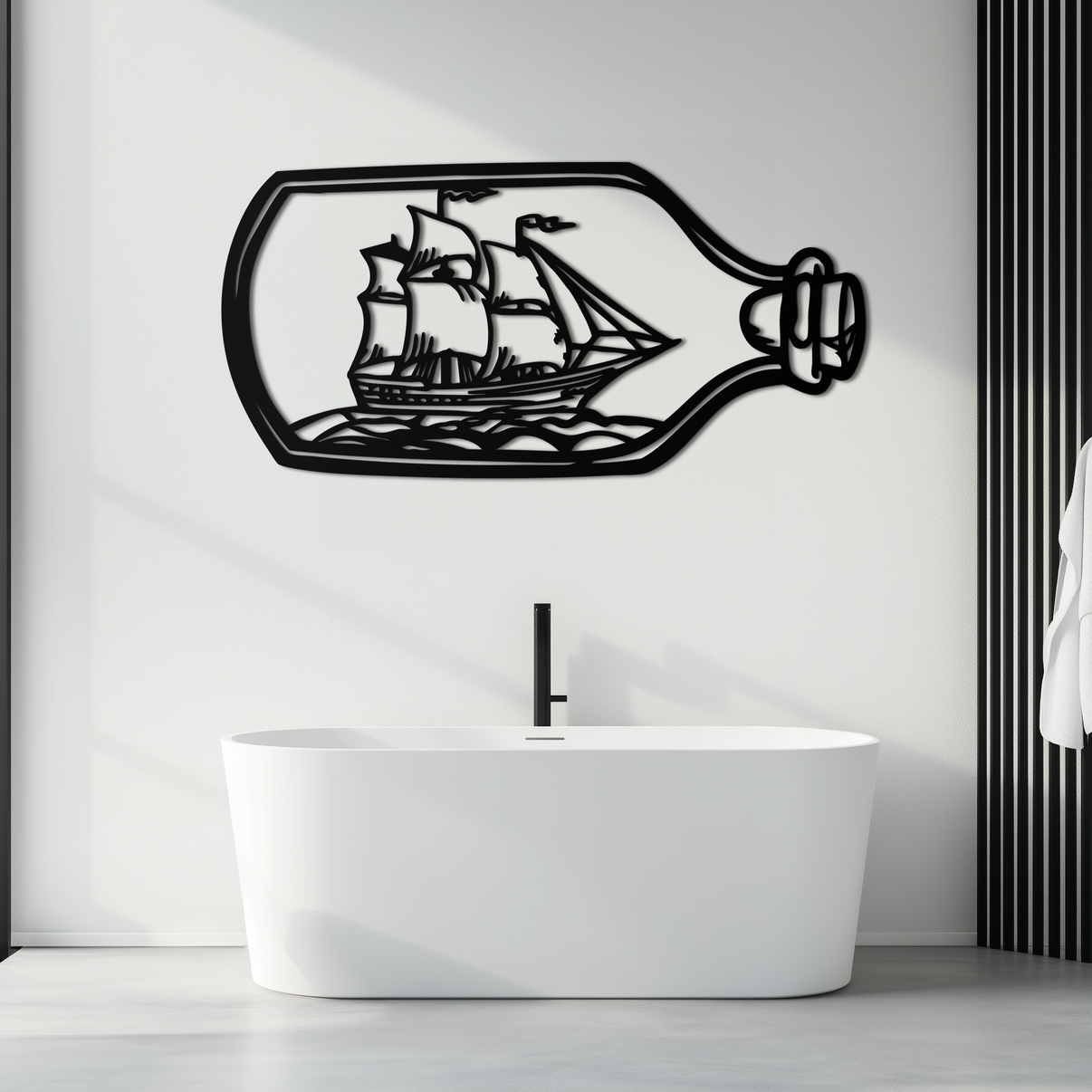 Capture the romance of the sea with this sailboat in a bottle metal wall art. Featuring a beautifully detailed silhouette of a classic sailboat encased in a bottle, this design symbolizes adventure, freedom, and the timeless love for the ocean. Perfect for nautical-themed interiors, it adds a serene and imaginative touch to any space.