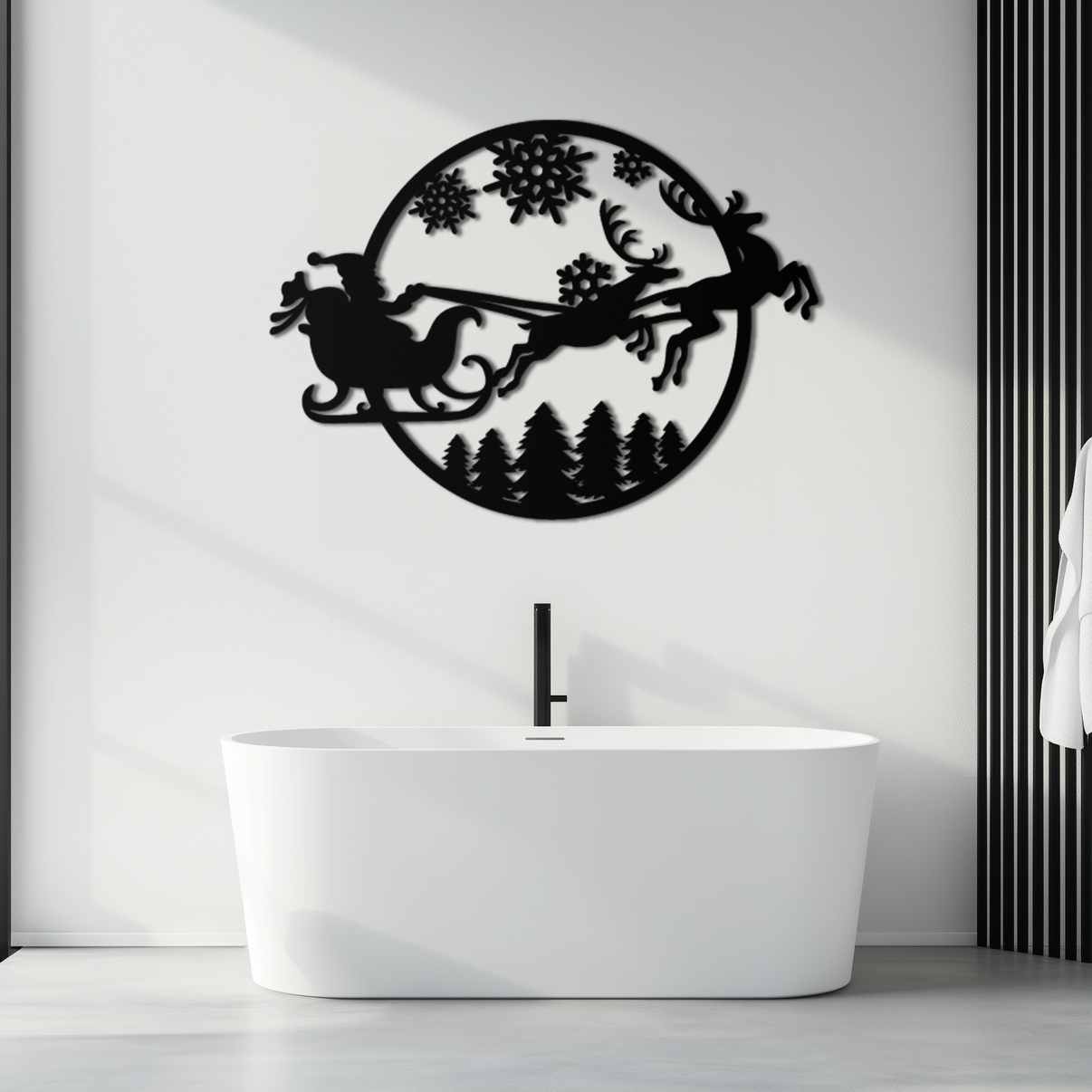Celebrate the magic of Christmas with this Santa Sleigh Metal Wall Art! Featuring a beautifully detailed design of Santa Claus riding his sleigh, pulled by flying reindeer and surrounded by delicate snowflakes, this metal decor adds a festive and cozy holiday touch to any space.