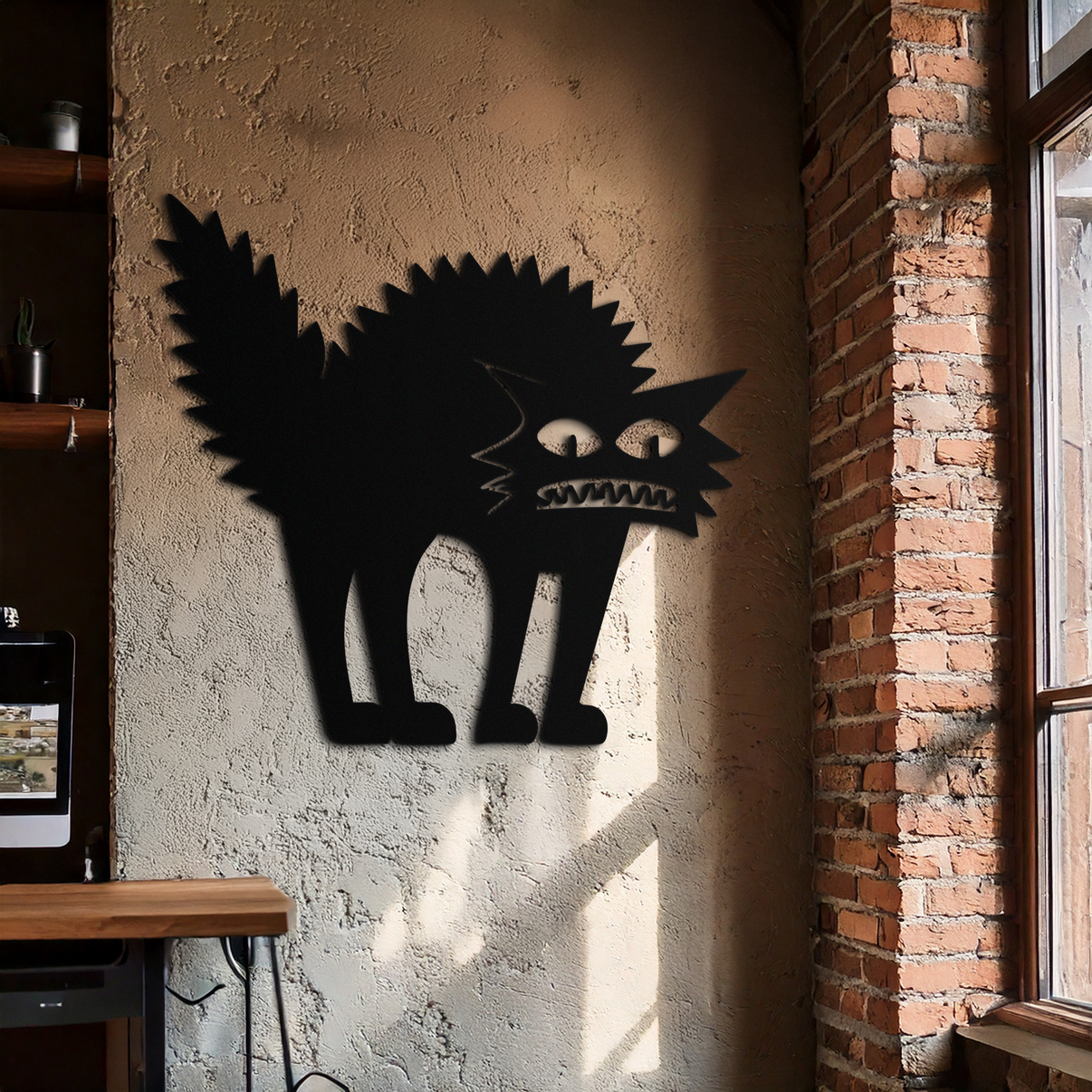 Bring a playful yet edgy touch to your home decor with our Scared Cat Silhouette Metal Wall Art. Featuring a spiky, startled cat design, this piece is crafted from durable 1.5mm premium steel and finished with a sleek matte black electrostatic powder coating. Ideal for Halloween themes or cat lovers looking for a bold statement piece.