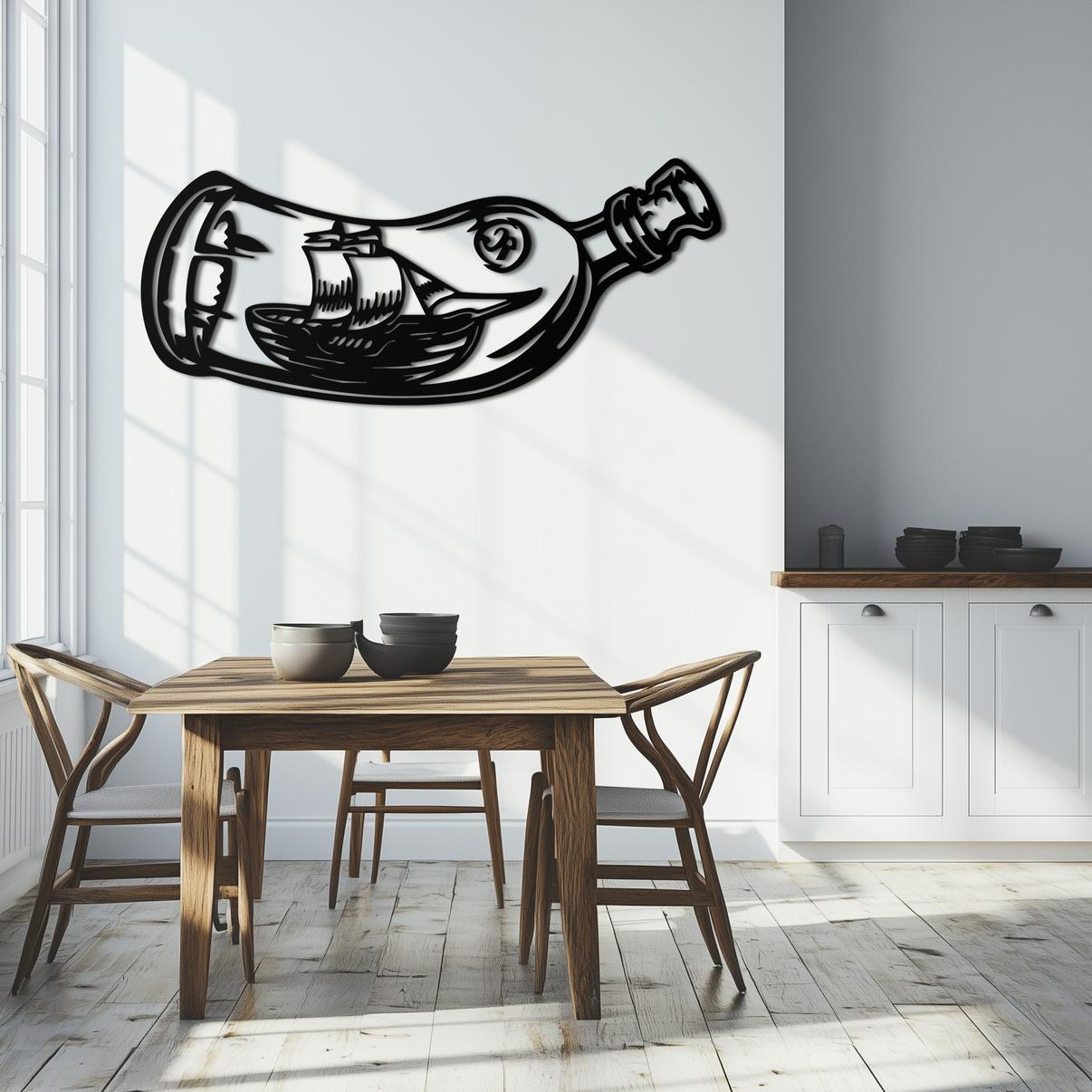 Bring the mystery and adventure of the seas into your home with this "Ship in a Bottle" metal wall art. Showcasing a classic sailing ship enclosed within a bottle, this sleek silhouette design captures the essence of maritime dreams and craftsmanship. Perfect for nautical décor lovers, this piece adds elegance and storytelling charm to any space.