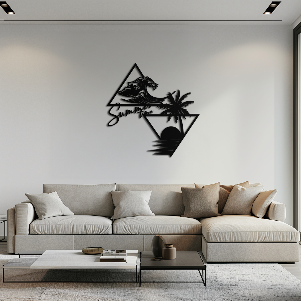 Capture the essence of summer with our Summer Time Beach Scene Metal Wall Art. Featuring dynamic ocean waves, a palm tree, and a serene sunset framed within geometric triangles, this piece adds tropical charm and modern flair to coastal-themed spaces, beach houses, vacation homes, or anywhere you want a touch of paradise.