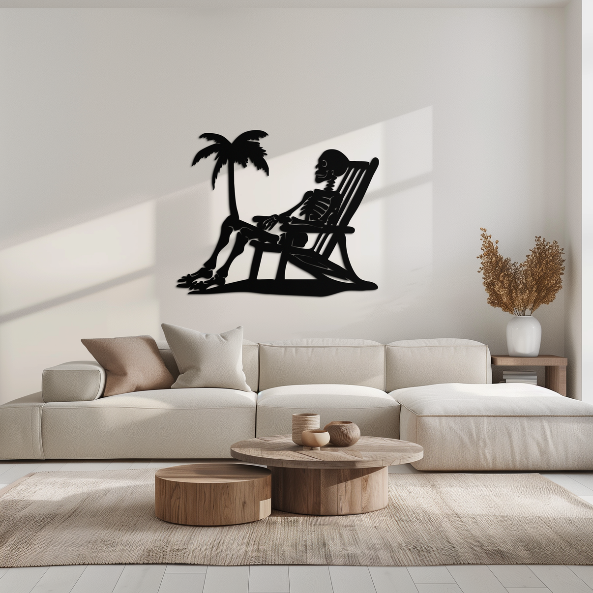 Add a quirky and bold twist to your space with this Sunbathing Skeleton Metal Wall Art. Featuring a skeleton lounging in a beach chair under a swaying palm tree, this humorous yet artistic piece blends tropical relaxation with gothic charm. Perfect for beach homes, unique interior themes, or Halloween lovers.