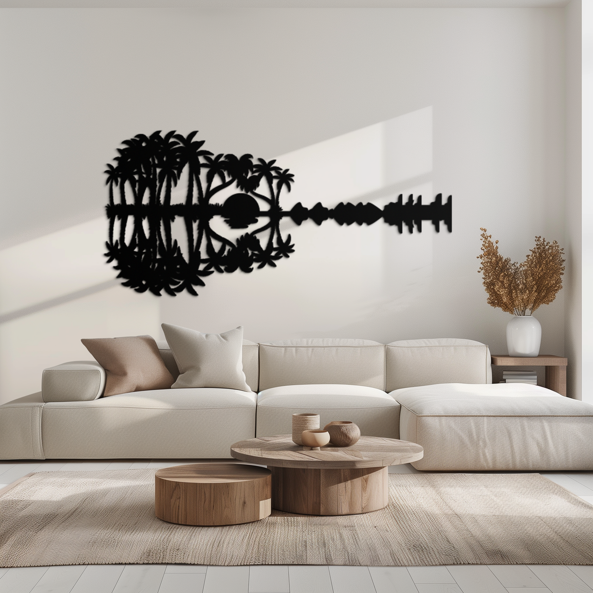 Bring harmony to your space with this Sunset Guitar Metal Wall Art, an exquisite fusion of music and nature. Featuring a guitar silhouette seamlessly integrated with a tropical landscape, this artwork beautifully depicts palm trees, a setting sun, and its reflection. The intricate detailing makes it a stunning centerpiece for any music lover, guitarist, or art enthusiast.