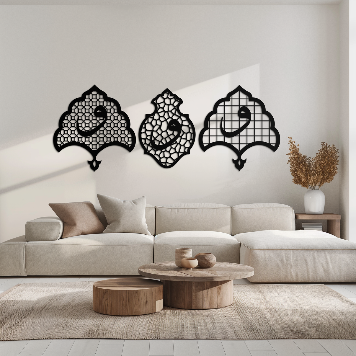 Enhance your home with the spiritual elegance of Vav Calligraphy Metal Wall Art. This beautifully crafted set features three distinct designs, each incorporating the sacred "Vav" calligraphy in an intricate geometric pattern. Symbolizing humility and devotion in Islamic culture, these pieces add a meaningful and artistic touch to any space.