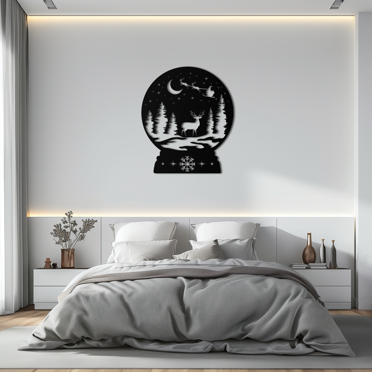 Transform your space with the whimsical charm of this Winter Deer Snow Globe Metal Wall Art. Inside a festive snow globe silhouette, a majestic deer stands among snow-covered pine trees under a starlit sky as Santa’s sleigh flies overhead. This captivating winter scene brings holiday spirit and rustic elegance to life—perfect for seasonal decoration or year-round woodland charm.