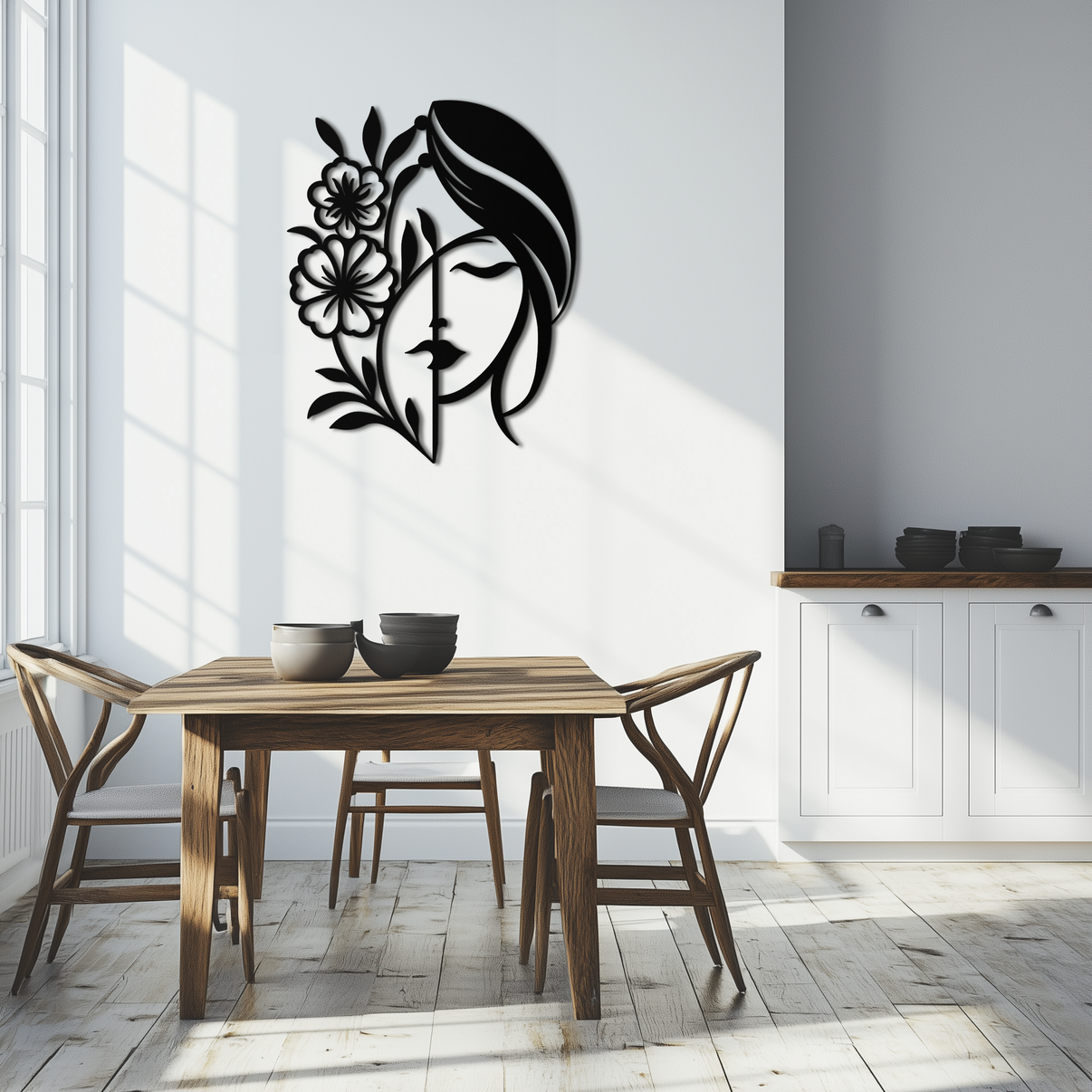 Elevate your interior with this "Woman with Flower" Metal Wall Art, showcasing a graceful female silhouette adorned with a blooming flower detail. This artwork blends modern style with delicate femininity, making it a stunning focal point for bedrooms, dressing rooms, or living spaces.