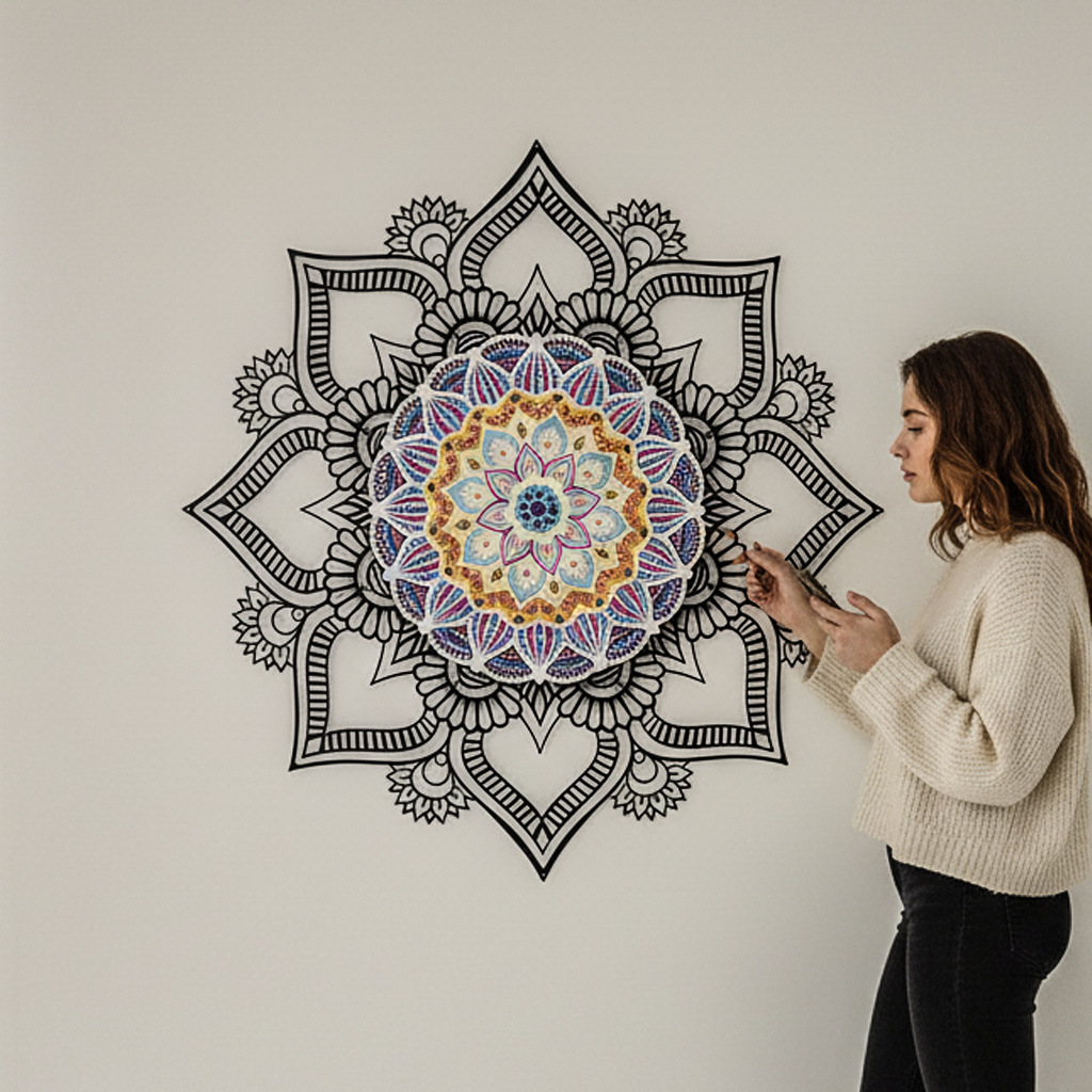 Introducing the Mandala Spinner Wall Art, an intricately designed, hand-powered piece of decor that blends sacred geometry with soothing motion. Crafted from precision-cut metal and detailed with a vibrant, multi-color mandala center, this 75x75 cm masterpiece does more than just sit pretty — it spins.