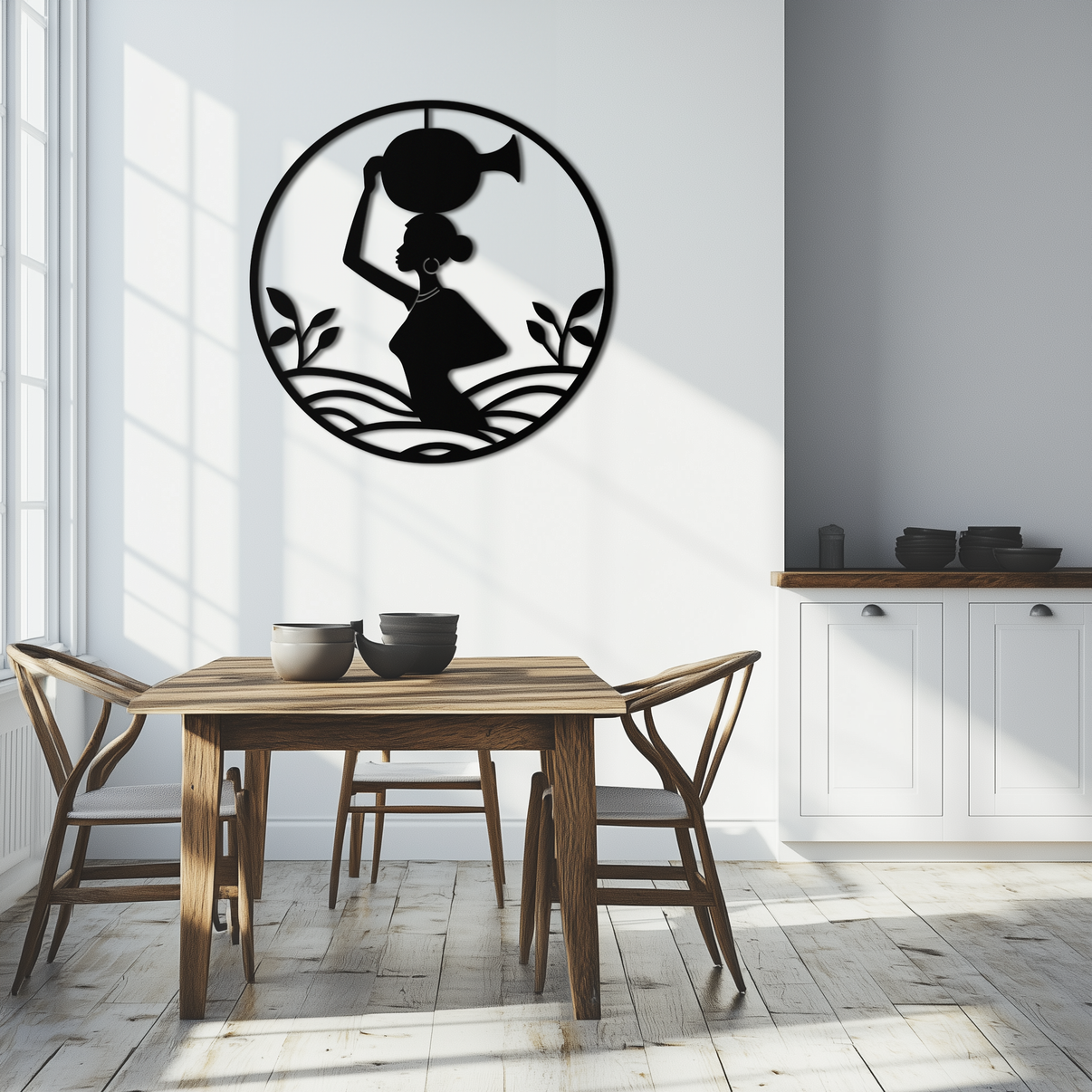 Celebrate culture, strength, and tradition with our African Woman Carrying Vase Metal Wall Art. Featuring a graceful silhouette of an African woman balancing a vase on her head, this piece reflects beauty, endurance, and heritage. Perfect for living rooms, hallways, ethnic-themed interiors, or studios.