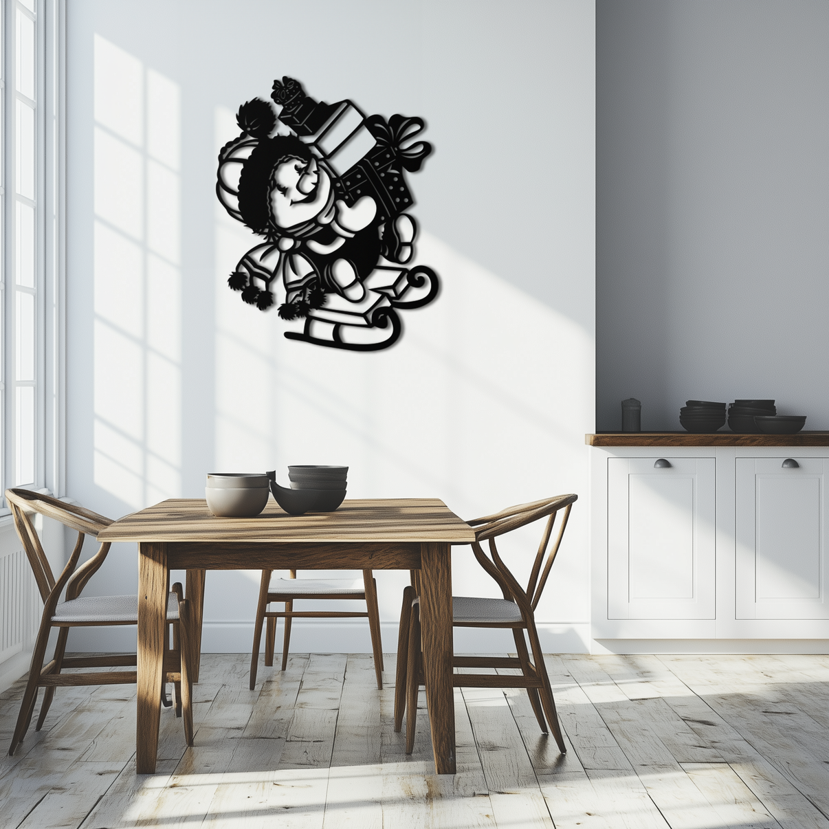 Celebrate the festive spirit with our Christmas Snowman Metal Wall Art! This delightful design features a cheerful snowman wearing a winter hat and scarf, joyfully carrying holiday presents on a sled. It’s the perfect seasonal accent for your home, office, or holiday party setup.