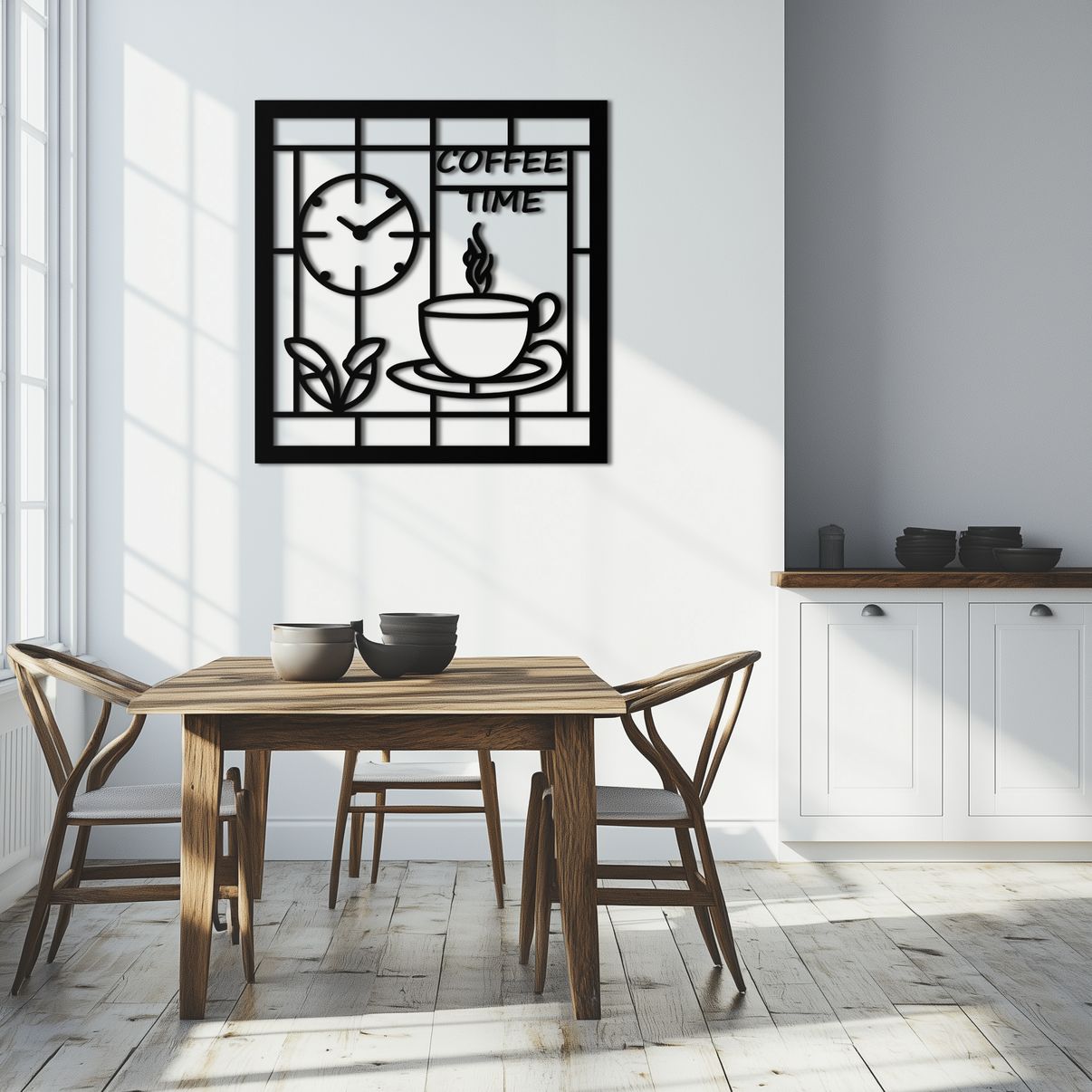 Bring charm and warmth to your kitchen or coffee nook with our Coffee Time Metal Wall Art. Featuring a bold coffee cup, swirling steam, clock, and the words “Coffee Time,” this stylish black metal decor adds a cozy and inviting touch to any space. Designed with clean lines and a modern frame layout, it's perfect for coffee lovers and interior design enthusiasts alike.