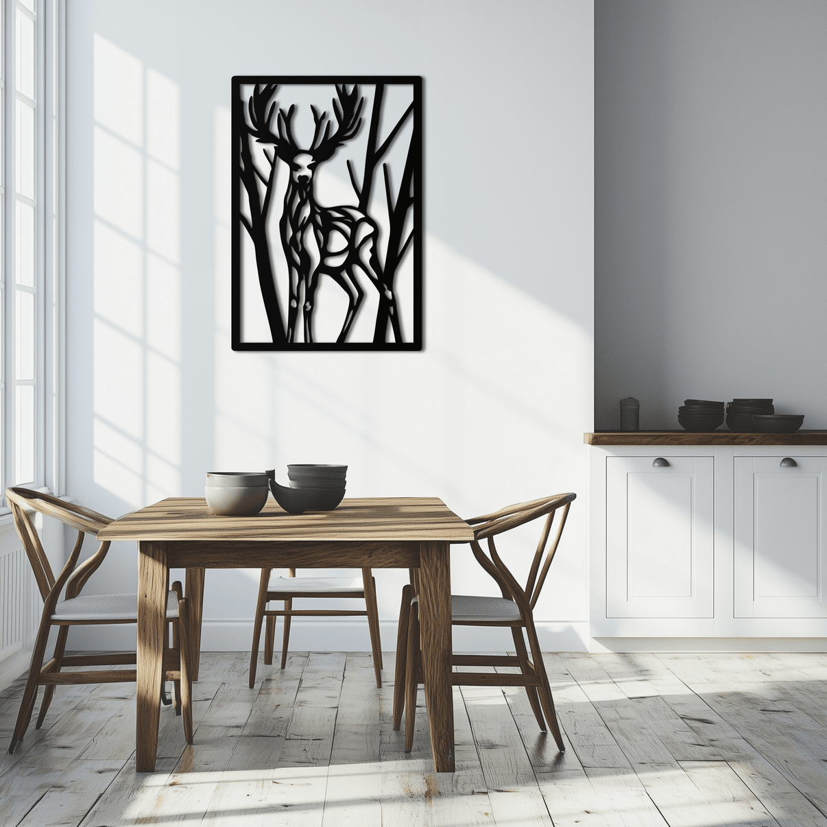 Transform your space with this stunning metal deer wall art, a laser-cut masterpiece designed for nature lovers and modern home decor enthusiasts. Featuring a majestic stag amidst abstract forest elements, this modern metal wall hanging is a perfect blend of elegance and wilderness.