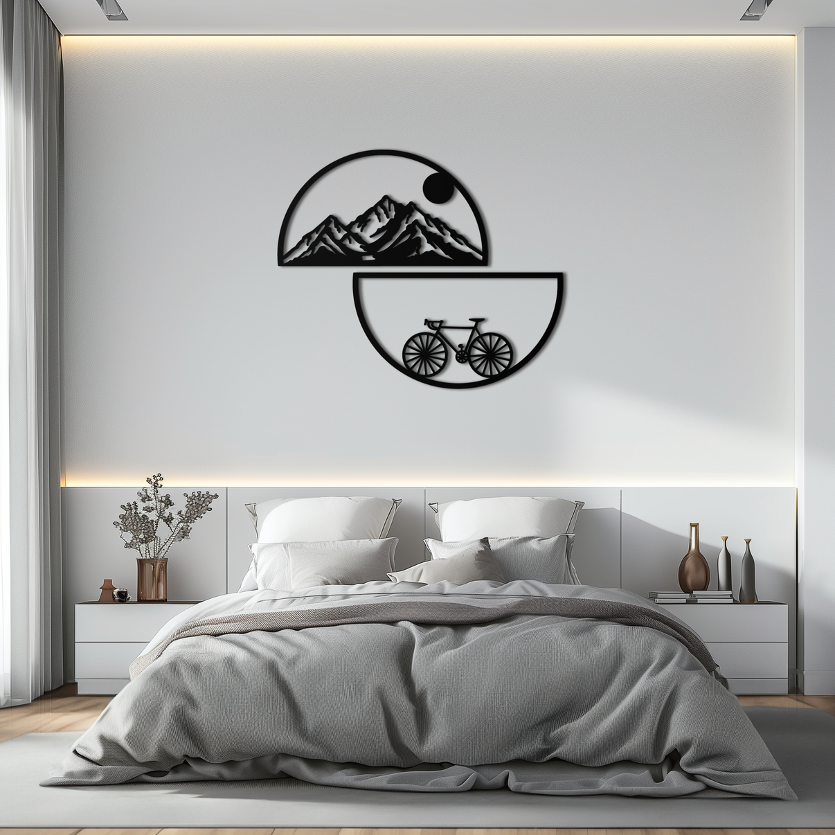 Transform your space with this stunning Mountain View Metal Wall Art, featuring a split design of rugged mountains and a detailed bicycle silhouette. The top half showcases a sunlit peak landscape, while the bottom mirrors a cyclist’s perspective – a perfect blend of adventure and nature in motion.