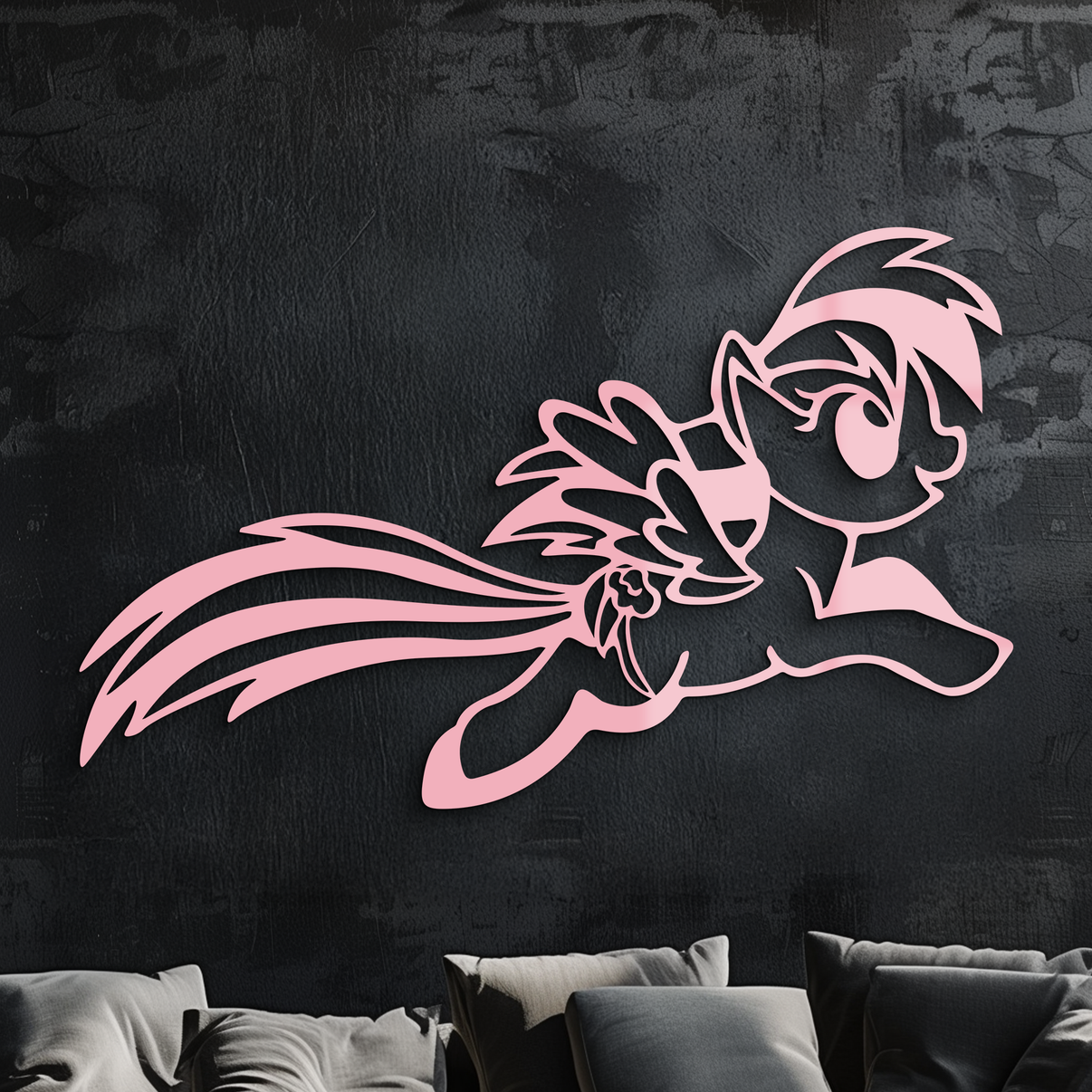 Bring joy and energy to your home with this My Little Pony Flying Silhouette Pink Metal Wall Art. Crafted from high-quality pink metal, this modern design captures the playful and magical essence of the beloved pony character in flight. Perfect for kids’ rooms, nurseries, or anyone who loves whimsical décor. Its vibrant pink color adds a bold, lively touch that enhances any wall space.