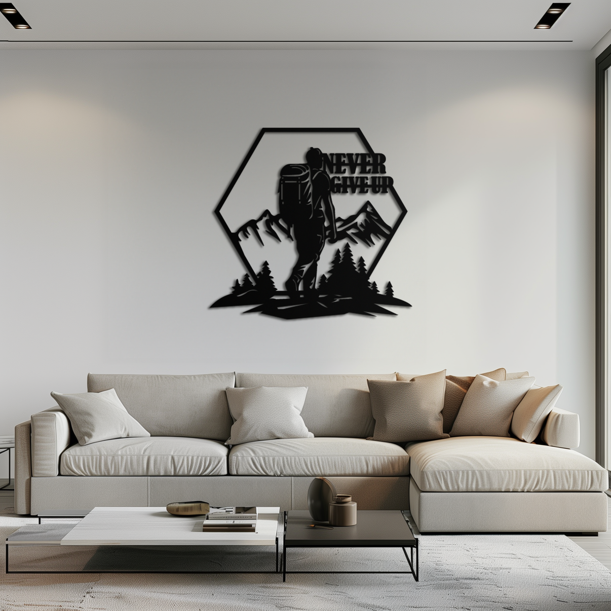 This modern Never Give Up Hiking metal wall art is the perfect way to add a touch of motivation and adventure to your home or workspace. Order yours today.