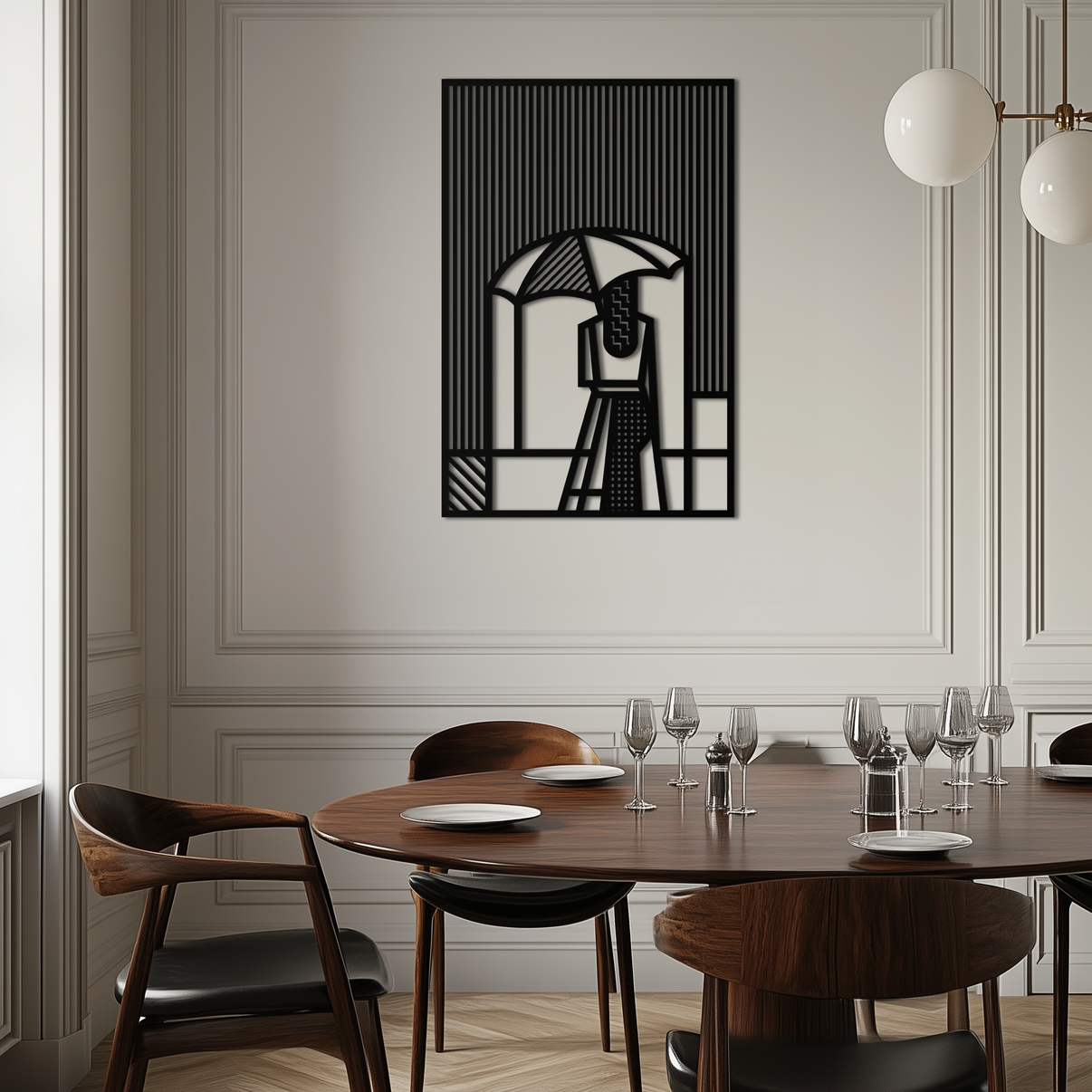 Step into a poetic moment with our Woman with Umbrella Abstract Metal Wall Art. Featuring a stylized figure holding an umbrella, this piece captures a quiet, rainy-day scene with elegant geometric patterns and bold minimalism. Ideal for modern interiors, entryways, or reading nooks seeking a touch of reflective charm.